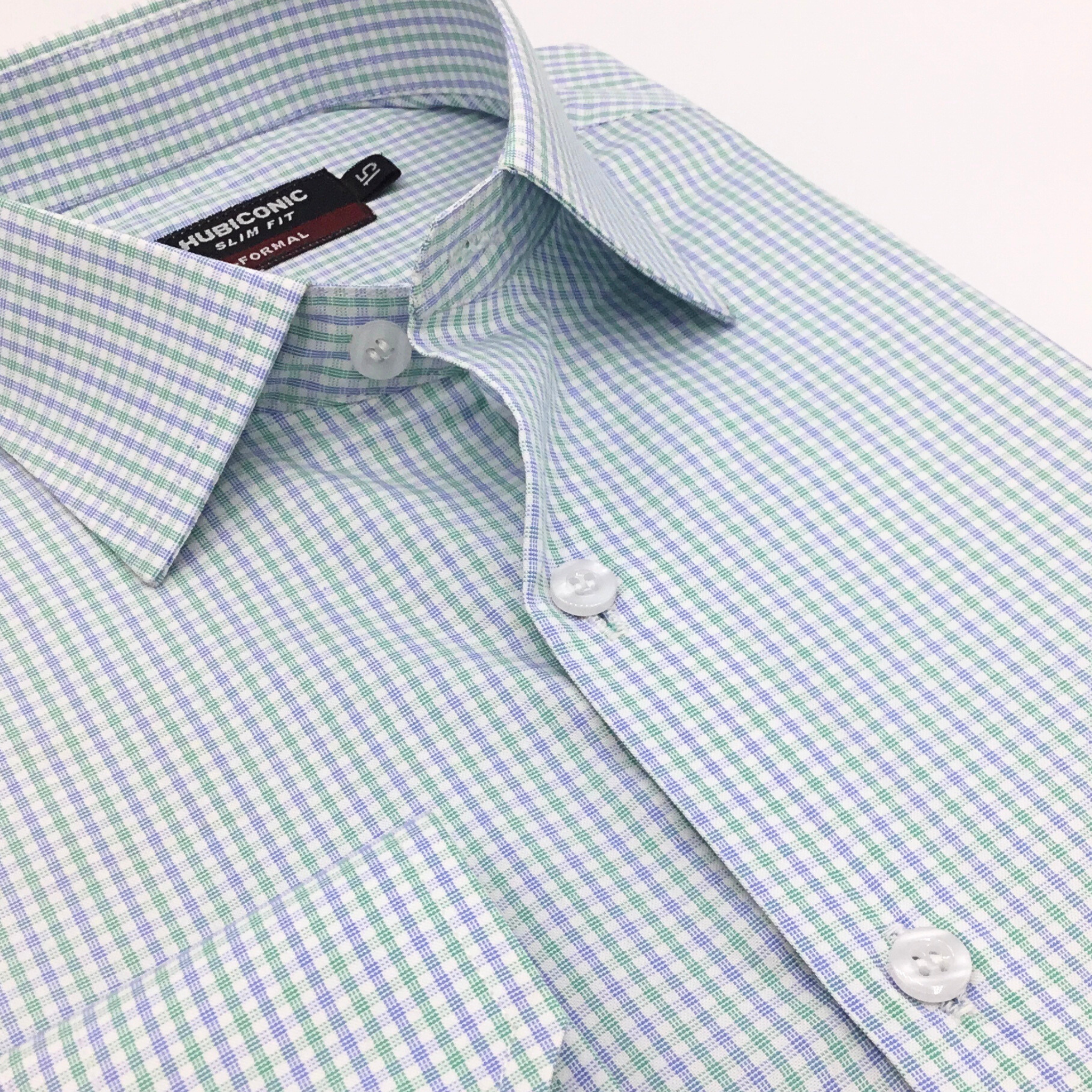 The intricate blue and green checkered patterns on the Harbor Dress Shirt are reminiscent of the beauty of the sea, evoking a sense of calm and tranquility that will make you feel at ease in any setting.